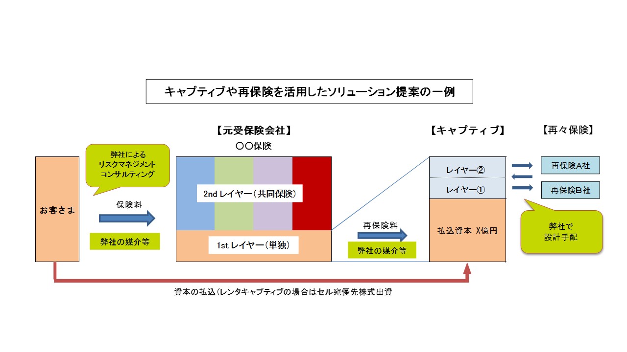 当社は、国内外の保険会社とのネットワークに加え、海外再保険会社や保険業以外のグローバル金融機関等との情報連携を通じて、保険市場、再保険市場、さらに保険市場と金融市場とが融合した保険リンク証券市場の動向等、世界の最新の保険・リスク情報を収集し、お客さまにとって最善のソリューションとなる保険商品・保険設計がご提案できる態勢の整備に努めています。また、保険設計の前段階となるリスクマネジメント全般に対するコンサルティング業務にも注力しております。さらに、バミューダにキャプティブを取扱うグループ会社を有する強みを活かし、リスクマネジメントとしてのキャプティブ活用を含めたソリューション提案等も展開しています。