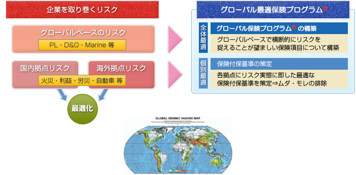 とは、海外拠点における「保険の最適化」を図ると共に、賠償責任保険等についてグローバルベースでのリスクを横断的にカバーする保険プログラムを構築することです。