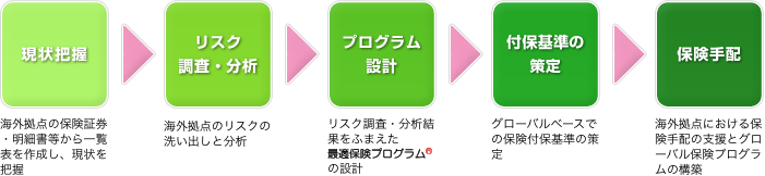 ファーストステップとして現状把握を行うために海外拠点の現行保険契約一覧表を作成し、合理化の余地や最適化の方向性について検討します。そのうえで、主要海外拠点のリスク分析を行い、改めて問題点と検討課題を抽出し、これらを解決する最適保険プログラムをご提案します。また、海外拠点における保険手配に関しては、当社提携ネットワークや現地保険会社を活用してサポートします。